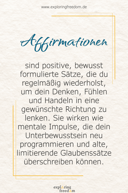 Affirmationen sind positive, bewusst formulierte Sätze, die du regelmäßig wiederholst, um dein Denken, Fühlen und Handeln in eine gewünschte Richtung zu lenken. Sie wirken wie mentale Impulse, die dein Unterbewusstsein neu programmieren und alte, limitierende Glaubenssätze überschreiben können.