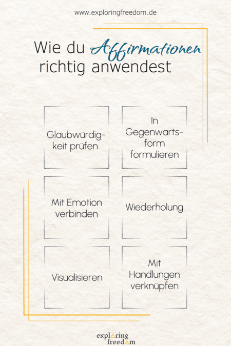 - Affirmationen erfordern Glaubwürdigkeit, Gegenwartsform, Emotion, Wiederholung, Visualisierung und Handlung.