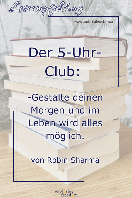 Meine Leseempfehlung zu Robin Sharmas Buch „Der 5‑Uhr-Club“ aus dem Jahr 2022 umfasst 400 Seiten und gehört zu den Genres Produktivität, Karrierestrategien und Kreativität. In einer fiktiven Geschichte zeigt dir der Autor, wie man eine 5-Uhr-Morgenroutine aufbaut und es schafft, täglich um 5 Uhr aufzustehen.